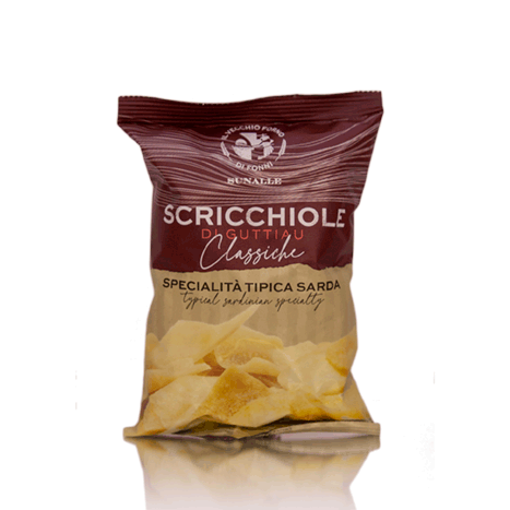 Die Scricchiole di Guttiau Classiche sind kleine, quadratische und knusprige Brotchips aus doppelt gemahlenem Hartweizengrieß. Hergestellt mit Sonnenblumenöl und einer Prise Salz, überzeugen sie durch ihren unverwechselbaren Geschmack und ihre goldene, knusprige Textur. Ideal als Snack für zwischendurch, für Aperitifs oder als Beilage zu Antipasti.